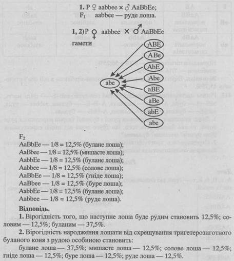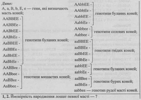 - 1. Якщо внаслідок схрещування рудої і буланої тварин народилося руде лоша, то яка ймовірність того, що друге лоша від цього схрещування буде рудим? соловим? буланим?