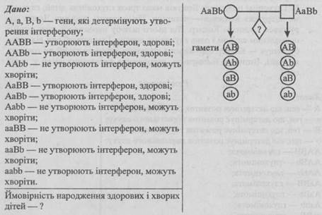 414. Утворення в клітинах людського тіла специфічного білка інтерферону пов’язане з комплементарною взаємодією двох домінантних неалельних генів (А і В), локалізованих у різних хромосомах (А — у другій, В — у п’ятій). Батьки здорові, але дигетерозиготні за генами А і В. Визначте ймовірність народження у них здорових і хворих дітей.