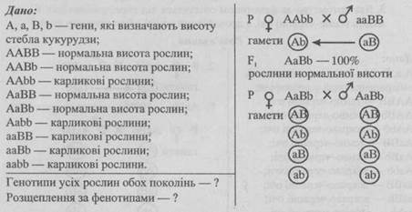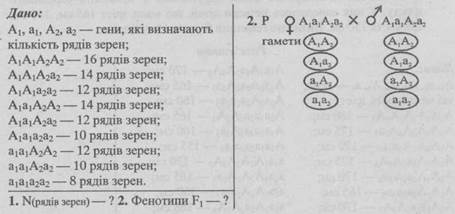- 2. Визначте фенотипи гібридів першого покоління від схрещування двох дигетерозиготних рослини кукурудзи з генотипом А1a1А2а2.