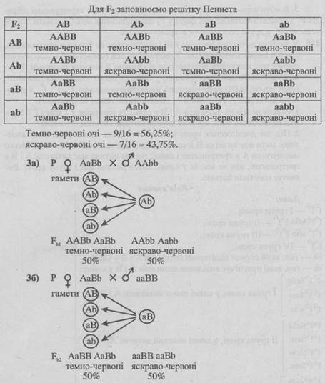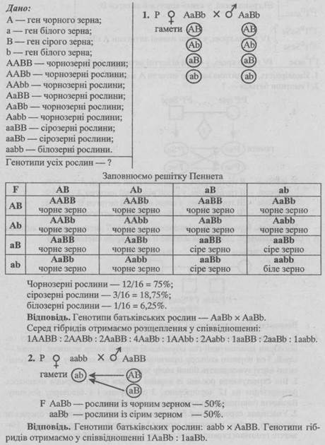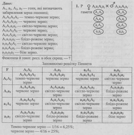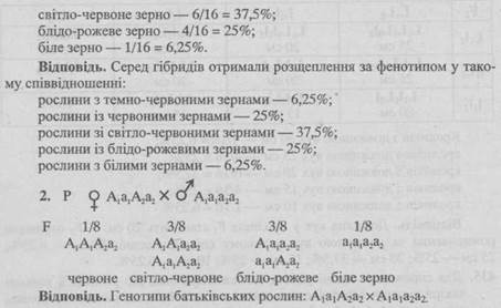 - 2. Унаслідок схрещування двох рослин зі світло-червоними і блідо-рожевими зернами отримали гібриди, серед яких було 1/8 рослин із червоними зернами, 3/8 — зі світло-червоними, 3/8 — із блідо-рожевими і 1/8 — з білими зернами. Які генотипи батьківських рослин?