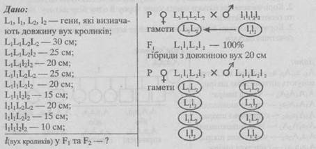 434. Вуха кроликів породи баран мають 30 см довжини, у інших порід — 10 см. Довжина вух залежить від двох пар генів з однозначною дією. Генотип кроликів породи баран — L1L1L2L2, звичайних кроликів — I1I1I2I2. Визначте довжину вух кроликів F1 та в усіх можливих генотипів F2.