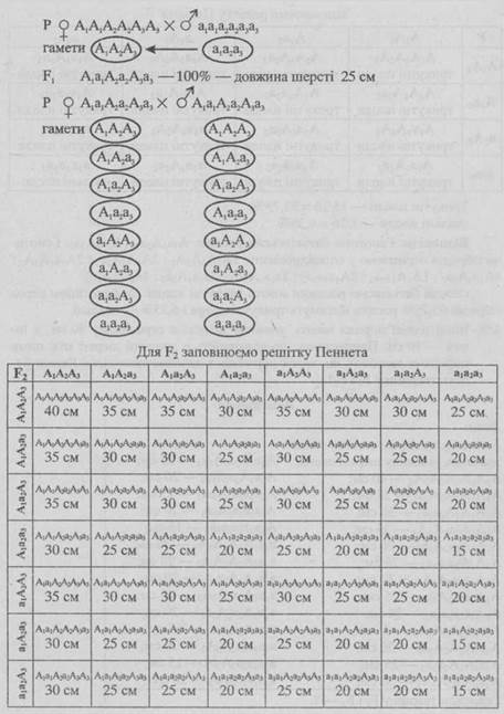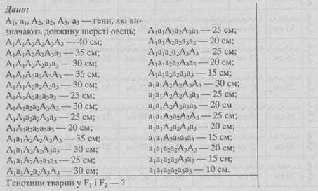 438. Вівці однієї породи мають довжину шерсті в середньому 40 см, а іншої — 10 см. Припустимо, що відмінність у довжині шерсті між цими породами залежить від трьох пар генів з однозначною дією. Якими будуть тварини у F1і F2?