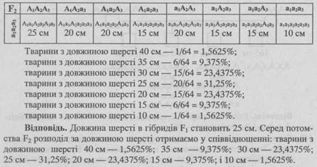 Відповідь. Довжина вух у кроликів F1 становить 20 см. У F2 отримали розщеплення за довжиною вух у такому співвідношенні: 30 см — 6,25%; 25 см — 25%; 20 см — 37,5%; 15 см — 25%; 10 см — 6,25%.