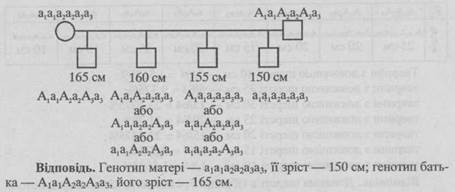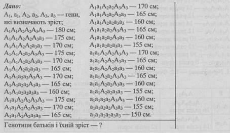 439. Зріст людини контролюється кількома парами незчеплених генів, які взаємодіють за типом полімерії. Якщо умовно обмежитись лише трьома парами генів і знехтувати соціальними факторами та впливом середовища, то можна припустити, що в певній популяції найнижчі люди мають усі рецесивні гени і зріст 150 см, а найвищі — всі домінантні гени і зріст 180 см. Низькоросла жінка одружилася з чоловіком середнього зросту. У них народилось четверо дітей, що мали зріст 165 см, 160 см, 155 см та 150 см. Визначте генотипи батьків і їхній зріст.