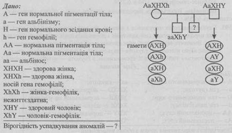 За фенотипом вірогідність народження темноволосої здорової дівчинки становить 37,5%; світловолосої здорової дівчинки — 12,5%; темноволосого здорового хлопчика — 18,75%; світловолосого здорового хлопчика — 6,25%; темноволосого хлопчика-гемофіліка — 18,75%; світловолосого хлопчика-гемофіліка — 6,25%.