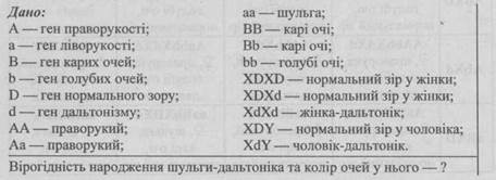 Відповідь. Вірогідність того, що наступна дитина в цій сім’ї буде шульгою-дальтоніком, становить 12,5%. Вірогідність народження кароокої дівчинки-шульги, хворої на дальтонізм, становить 3,125%; голубоокої шульги-дальтоніка — 3,125%; кароокого хлопчика-шульги, хворого на дальтонізм — 3,125%; голубоокого шульги-дальтоніка — 3,125%.