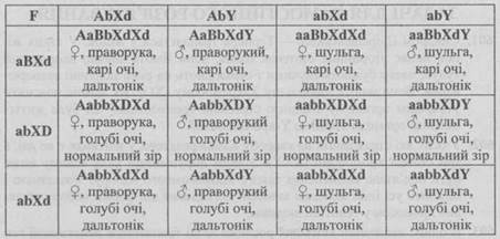 - 2. Самка з F1 утворює 4 типи гамет: АХВ; АХb; аХВ; аХb. Самець з F1 утворює 4 типи гамет: АХВ; AY; аХВ; aY.