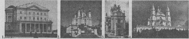 Архітектура. У другій половині XVIII ст. досягла найвищого піднесення архітектура козацького бароко. Саме в цей період були споруджені Маріїнський палац, Андріївська церква в Києві (1747-1757 рр., архітектор Ф.-Б. Растреллі), надбрамна церква з дзвіницею в Кирилівському монастирі, церква Миколи Набережного на Подолі, Покровська церква в Києві (1766 р.), собор Різдва Богородиці в Козельці (архітектор І. Григорович-Барський), дзвіниці Києво-Печерської лаври, Кловський палац у Києві, церква Антонія і Феодосія у Василькові (архітектор С. Ковнір), козацька Троїцька соборна церква в Самарській слободі (Новомосковську, 1773—1778), описана в романі Олеся Гончара «Собор» (майстер Я. Погребняк), Успенська соборна церква Почаївської лаври (1771-1783 рр., архітектор Г. Гофман), собор св. Юра у Львові зі скульптурною групою святого Юрія Змієборця на фасаді скульптора Й. Пінзеля (1746-1762 рр., архітектор Б. Меретін), палац Кирила Розумовського в Батурині (1799-1803 рр., архітектор Ч. Камерон, класичний стиль) та інші перлини архітектури.